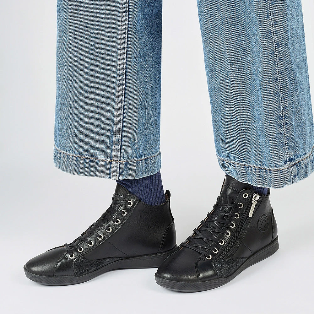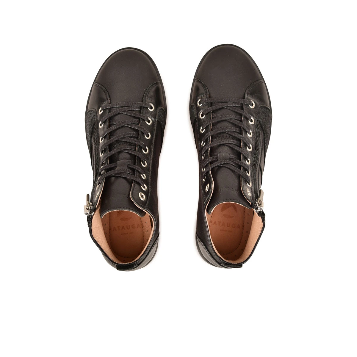 Nouvelle création Pataugas de la saison, la basket montante en cuir PALME joue avec les matières. Du cuir glossy pour la féminité, du cuir lisse pour la robustesse et du cuir suédé légèrement pailleté pour de la douceur. Son confort reste toujours inégalé grâce à sa semelle FLEX.